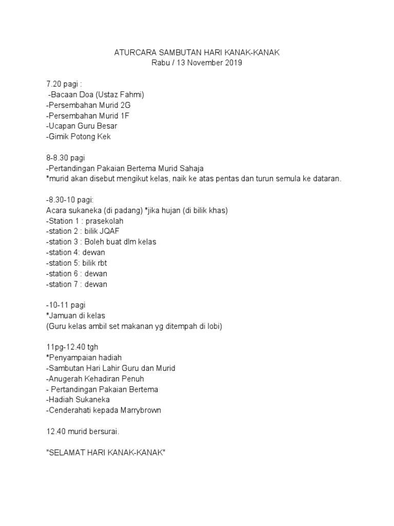 Adakah anda sedang mencari Sambutan Hari Kanak Kanak Templat muzik latar belakang. PDF On May 1 2014 Salman Firdaus Sidek and others published PEMBANGUNAN PERISIAN KURSUS SAYA SUKA BELAJAR UNTUK PEMBELAJARAN BAHASA MELAYU BAGI KANAK-KANAK AUTISME Courseware Development. Kemas kelas ATUR CARA SAMBUTAN HARI KANAK-KANAK 2017 17 NOVEMBER 2017 HARI JUMAAT SESI PETANG.
